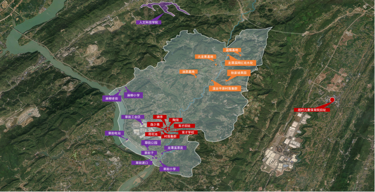 项目位于重庆市合川区草街街道,覆盖古圣村、龙潭村、桂林村等部分区域以及草街子、麻柳老街、战时儿童保育院旧址、重庆人文科技学院,占地约32平方公里。项目依托全国重点文物保护单位育才学校旧址,重点实施育才学校旧址和陶行知先生纪念馆修缮及展陈升级,并建设行知研学中心、“笃行园”红色体验基地、“致知园”红色教育基地、“行知园”红色文旅融合基地、育才学校校史馆、生活教育工场研学基地、生活教育农事体验园、教师培训中心、主题滨江商业街、红色时光渡口、红色研学旅宿配套区、溪岸农耕文化精品民宿区、红色旅游登山步道等。