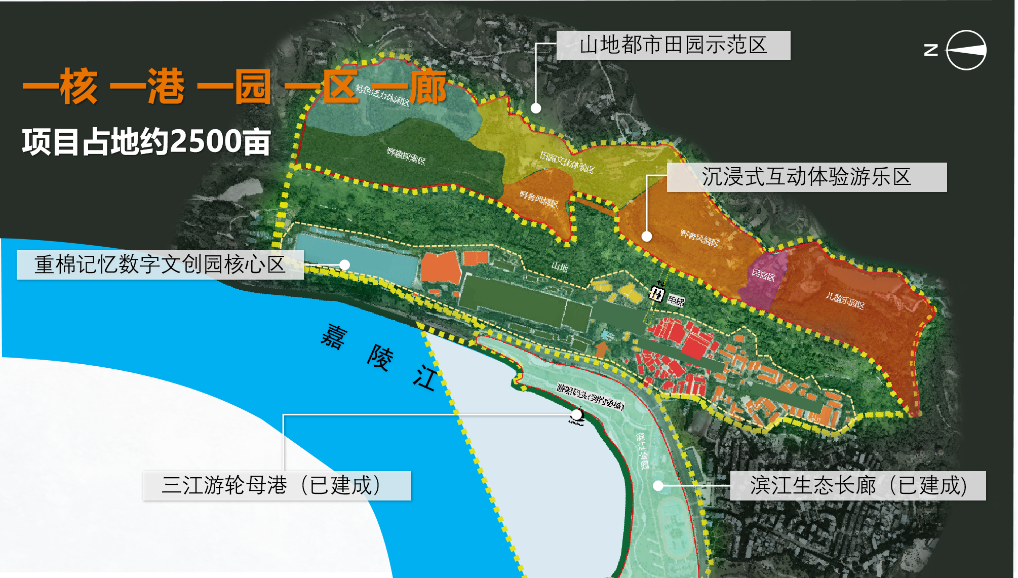 项目占地约2500亩,由“一核一园一区一港一廊”五部分组成。其中,一核(重棉四厂工业遗址核心区)占地约700亩,由生产区、生活区和管理区三部分组成,建筑面积约13万平方米;一园(山地都市田园)占地约500亩、一区(沉浸式互动体验游乐区)占地约500亩;一港(三江游轮母港)水陆面积约300亩、一廊(滨江生态长廊)占地约500亩。项目依托钓鱼城大IP,发掘和利用重棉四厂工业遗址的历史文化价值,形成工业遗产串接产业集群的新型特色文创空间,建设集文化展示、主题游乐、数字文创、实践研学、休闲度假等于一体的沉浸式文旅融合发展文创园。项目位于重庆市合川区南津街街道东津沱原重棉四厂厂区及周边,地处嘉陵江与白塔坪之间,与国家级风景名胜区、全国重点文物保护单位、国家考古遗址公园、国家4A级旅游景区钓鱼城隔江相望,是钓鱼城大景区的重要组成部分,是合川"十四五"期间重点打造的文创体验项目。