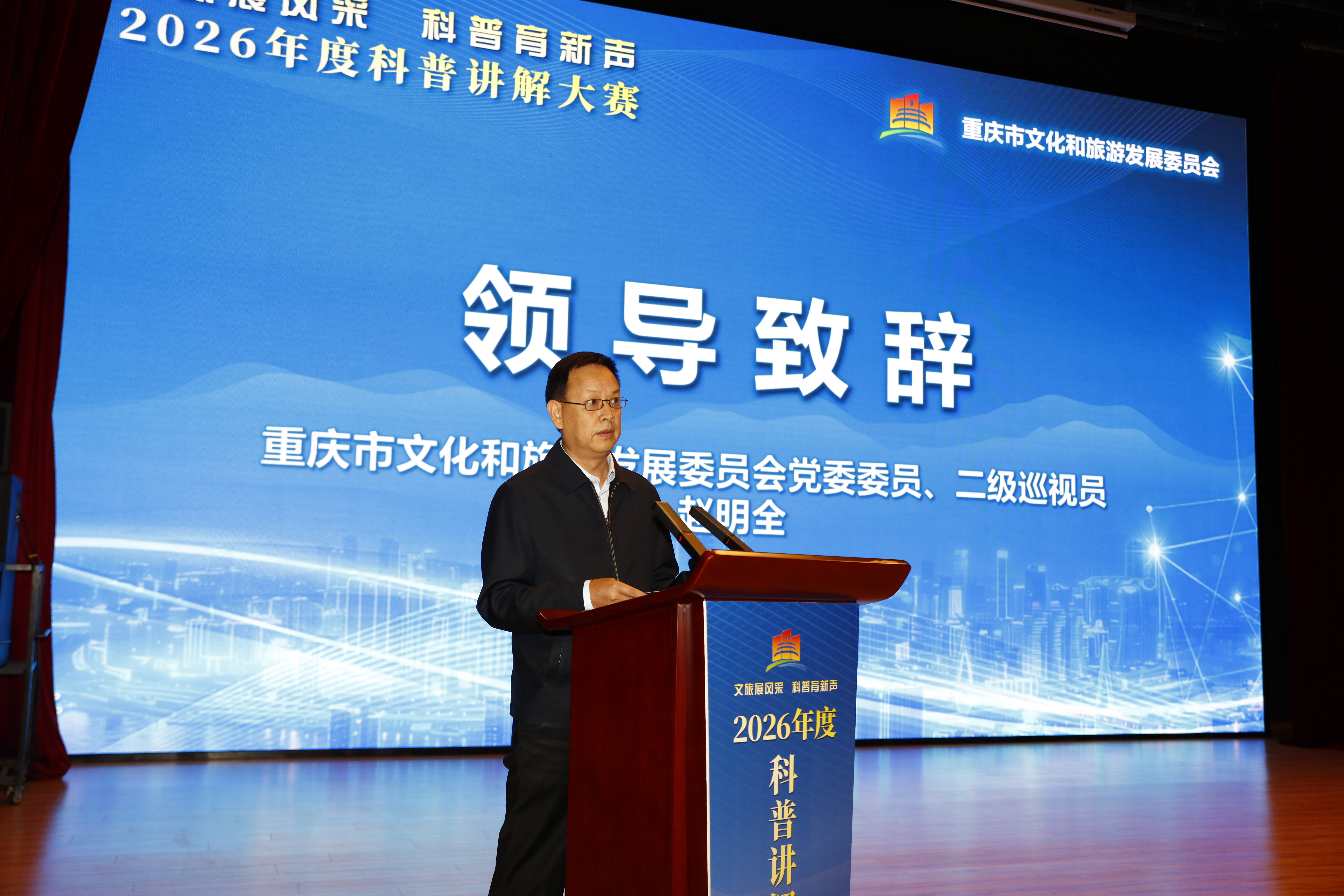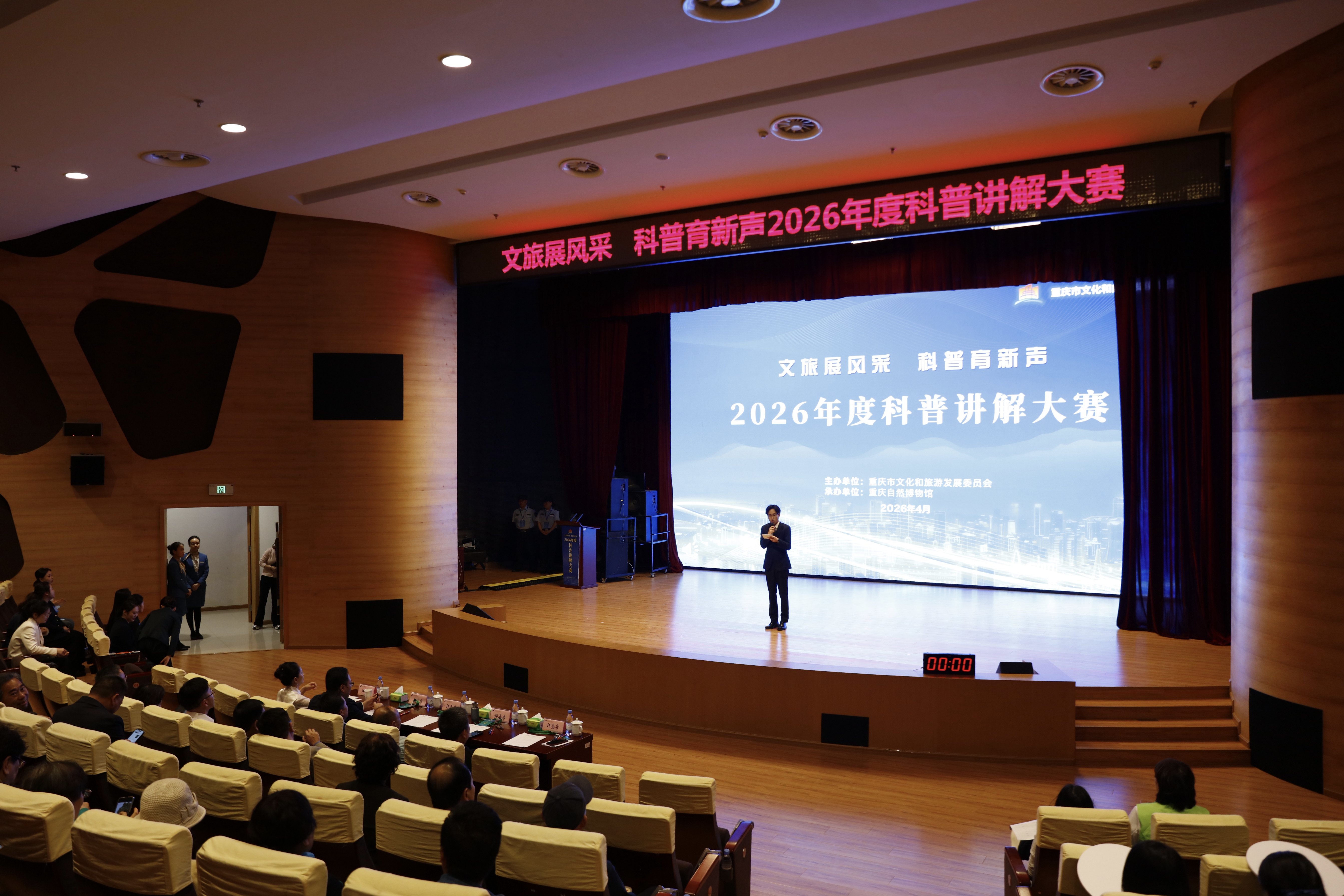 为助力重庆打造西部科普中心、提升全民科学素质,推动“科学+文旅”深度融合,4月20日,由重庆市文化和旅游发展委员会主办、重庆自然博物馆承办的2026年市文化旅游委系统科普讲解大赛在重庆自然博物馆圆满落幕。市文化旅游委党委委员、二级巡视员赵明全出席活动并致辞,来自科协、教育、文博等领域的5位资深专家担任评委。