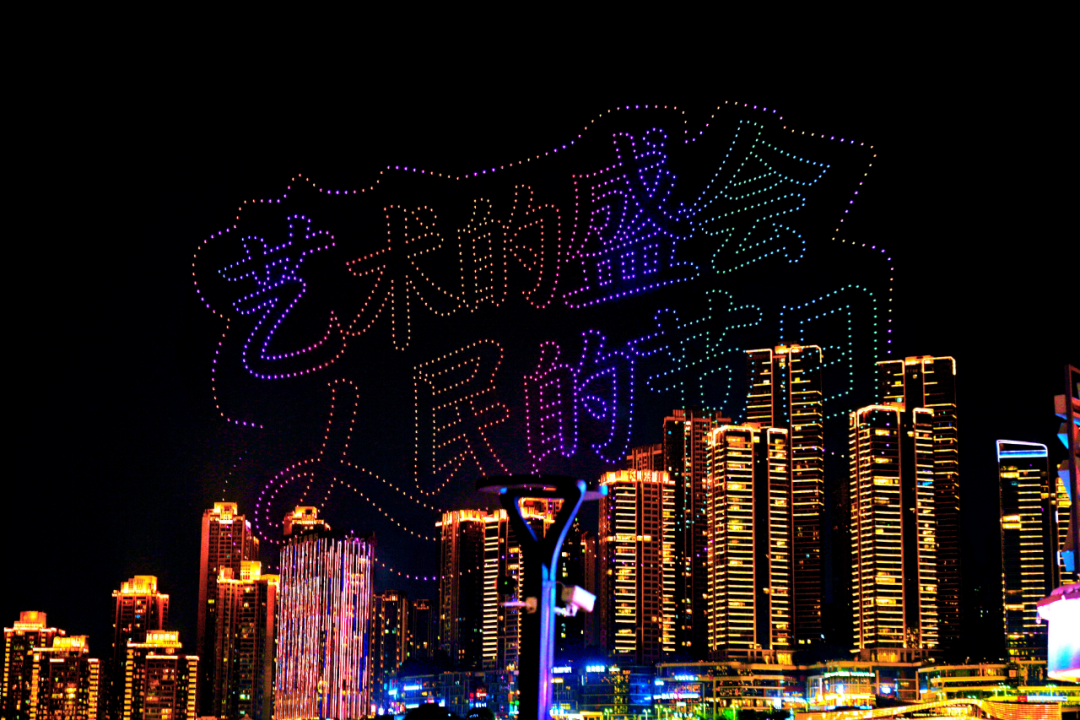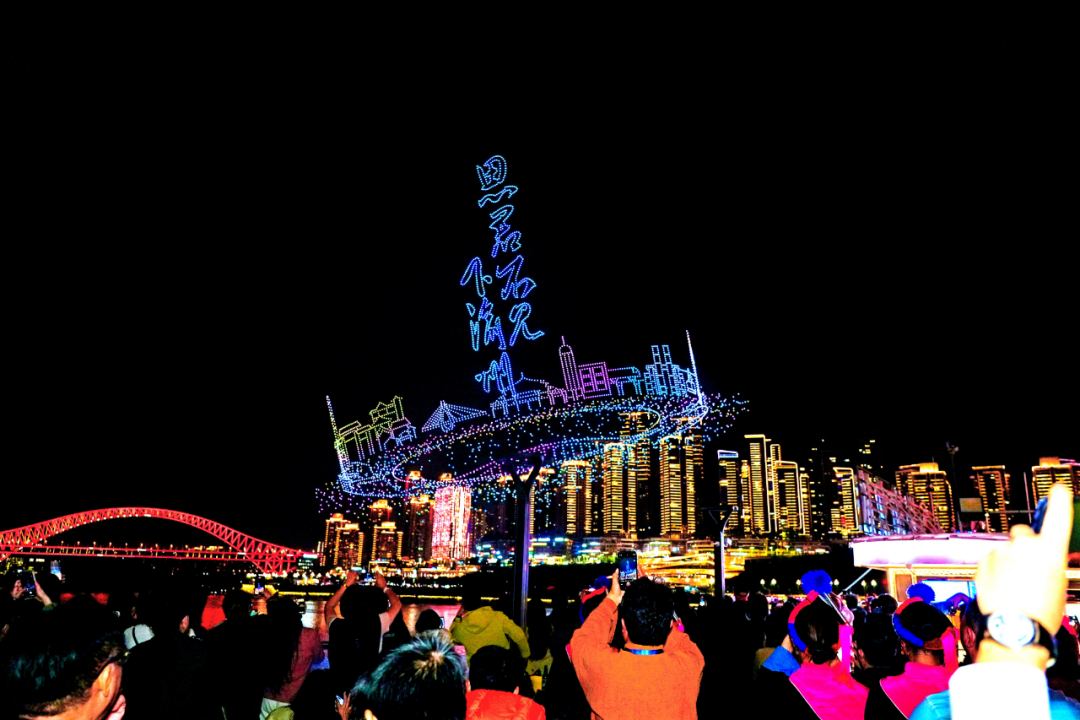 18时40分,游轮停靠重庆大剧院水域,“新韵重庆”专场无人机灯光秀惊艳上演,这场作为第十四届中国艺术节闭幕式专场的光影盛宴,以夜空为幕、光影为笔,串联起重庆的山水之美、文化之韵与艺术之魂,为在场嘉宾呈现了一场载入城市记忆的视觉狂欢。随着无人机群精准编队,“在重庆”字样以七彩流光点亮夜空,向八方来客致以山城最热情的问候;“雄奇山水 新韵重庆”的字样缓缓浮现,将山的坚韧与水的灵动交织,尽显城市山水肌理与时代活力;艺术节标志以立体雕塑造型凌空显现,“艺动巴山蜀水,共绘时代新篇”12字如诗铺展,呼应川渝文脉、凝练艺术精神。更令人称绝的是,川剧“变”的哲学融入编排,将地域物产化为文化图腾,诠释传统艺术的创新生命力;Q版熊猫“莽小五”脚踩冲浪板滑过夔门,演绎“轻舟已过万重山”的诗意与重庆人的豁达;三星堆“青铜大立人”与芭蕾舞者在星河下共舞,实现古蜀文明与西方艺术的跨时空对话;舞者水袖流转间,洪崖洞鎏金轮廓同步浮现,让城市地标化作舞动的文化符号。最后,“艺术的盛会,人民的节日”十个立体大字磅礴展开,七彩光带环绕飞舞,万千烟花特效腾空绽放,在星光与光影的交响中为艺术节送上美好祝愿,精湛的编排引来嘉宾们阵阵惊呼与快门声。