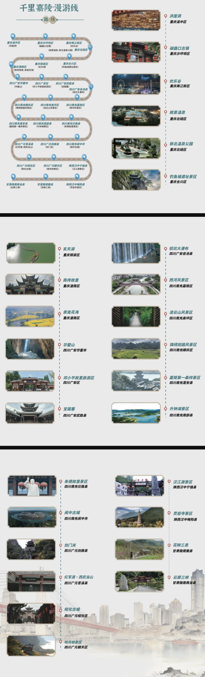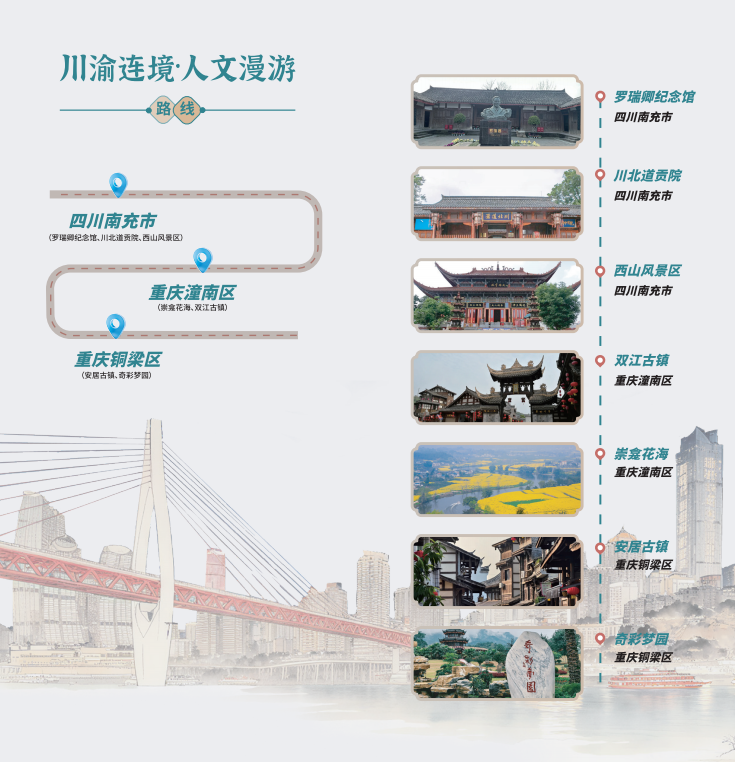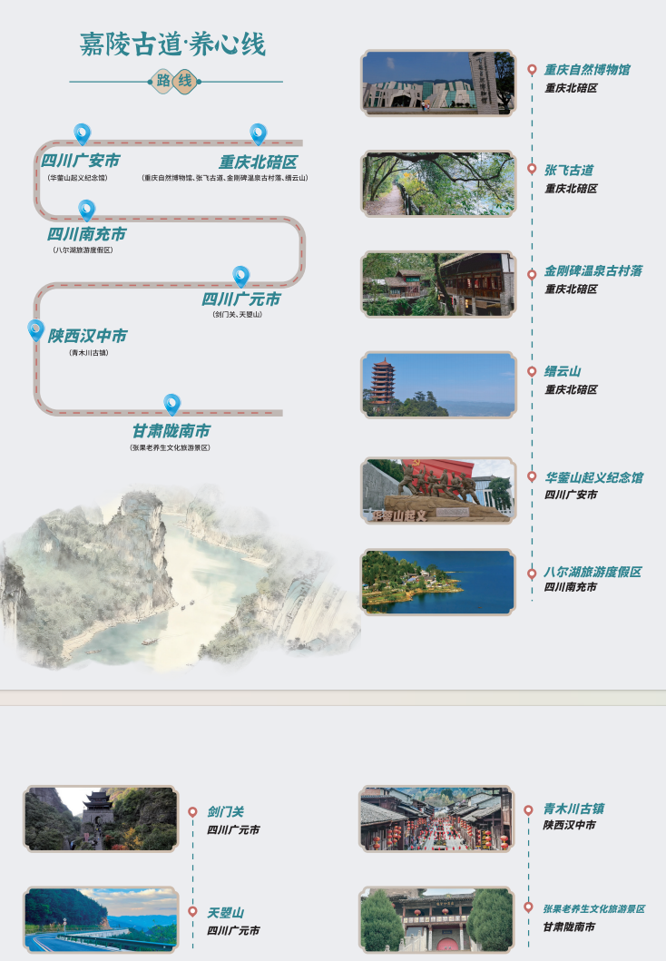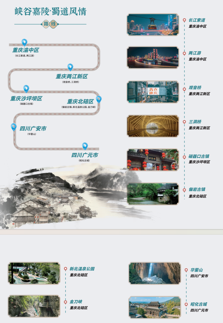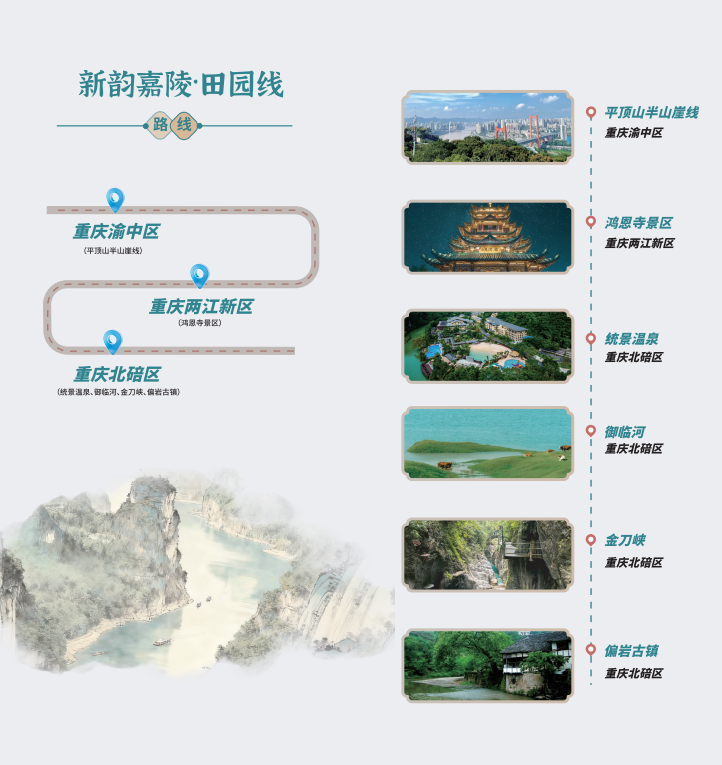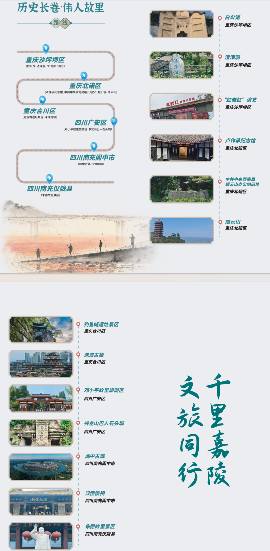“千里嘉陵·漫游线”串联起重庆渝中洪崖洞、沙坪坝磁器口、重庆欢乐谷,北碚统景温泉、合川钓鱼城、铜梁玄天湖、四川广安华蓥山、邓小平故里、阆中古城等地;“嘉陵古道·养心线”则串联三国文化、红色记忆、禅道智慧与生态康养,线路全长逾千公里,横跨五市;“新韵嘉陵·田园线”可沿平顶山半山崖线的空中步道俯瞰两江交汇,可走进偏岩古镇感受三百年青石老街的温润烟火,可在金刀峡穿行悬栈飞瀑间体验峡谷探险的酣畅,为游客带来自然与人文交织、传统与新潮碰撞的沉浸式体验。